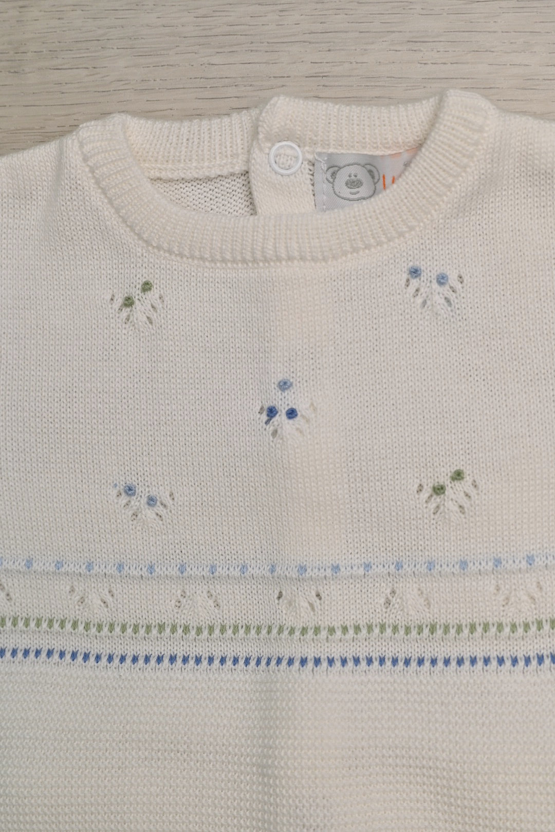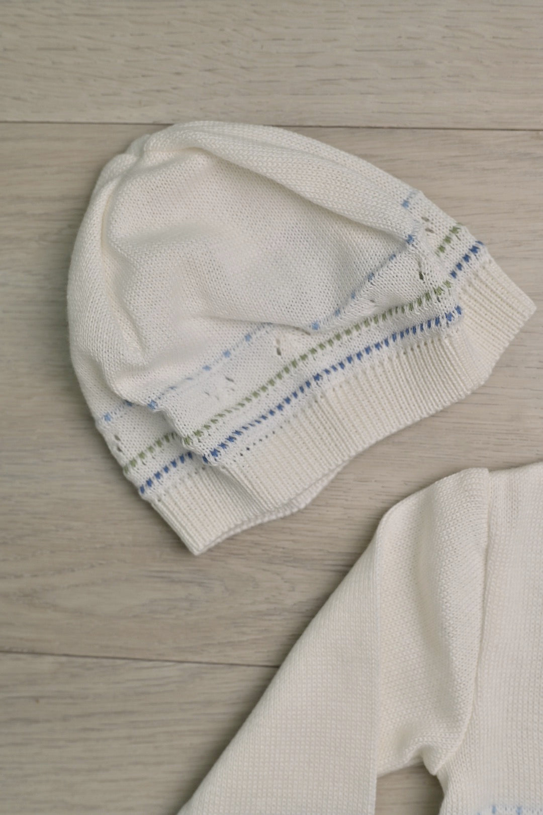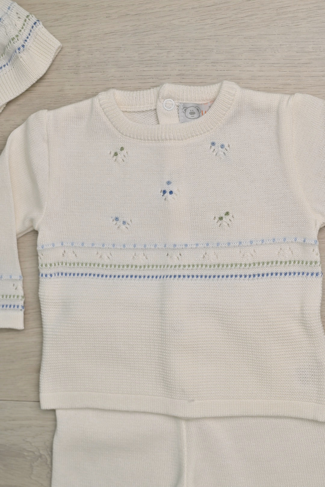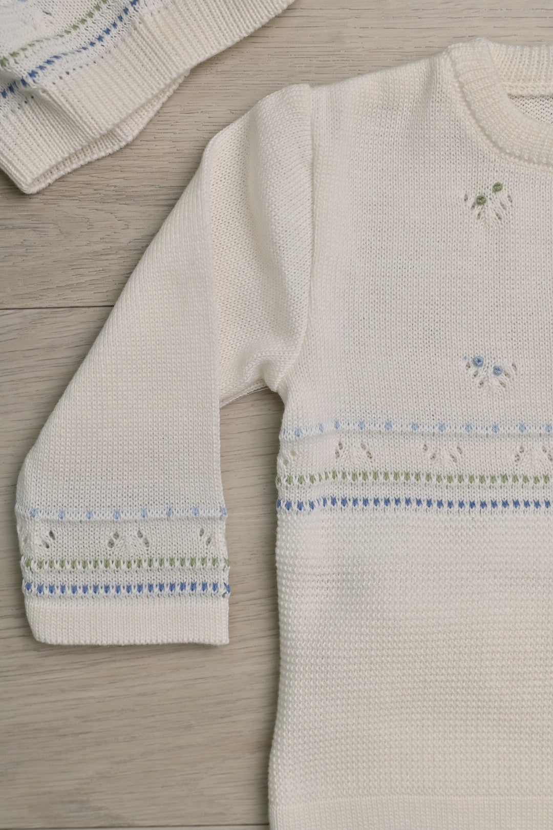 Elegant baby set in soft ivory is beautifully accented with exquisite pink and green details, creating a delicate and timeless look. Crafted with comfort in mind on 100% Peruvian cotton.