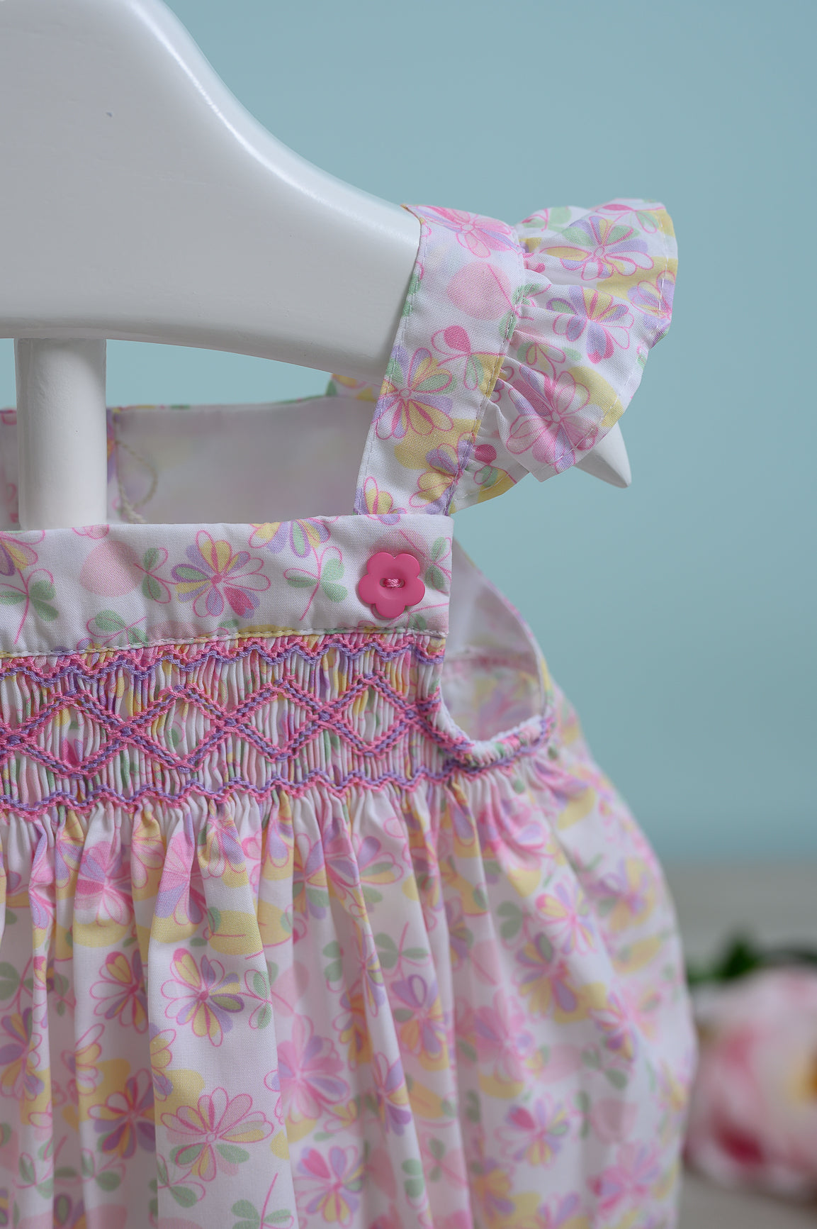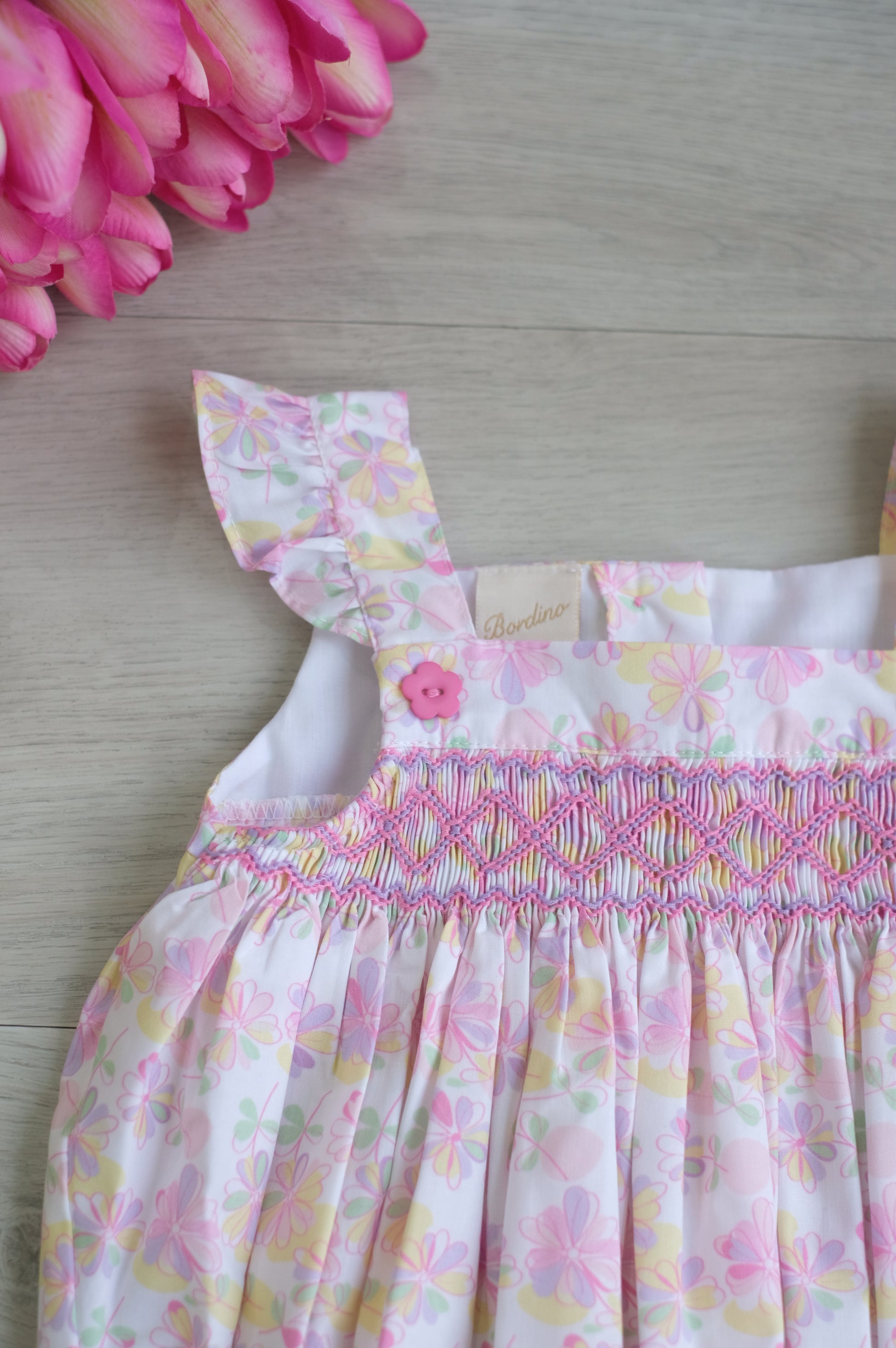 A delicate short-sleeve bubble romper with beautiful floral print and fine smock embroidery. The Happy Spring Day Bubble combines comfort, charm, and timeless spring elegance for your little one. 100% cotton.