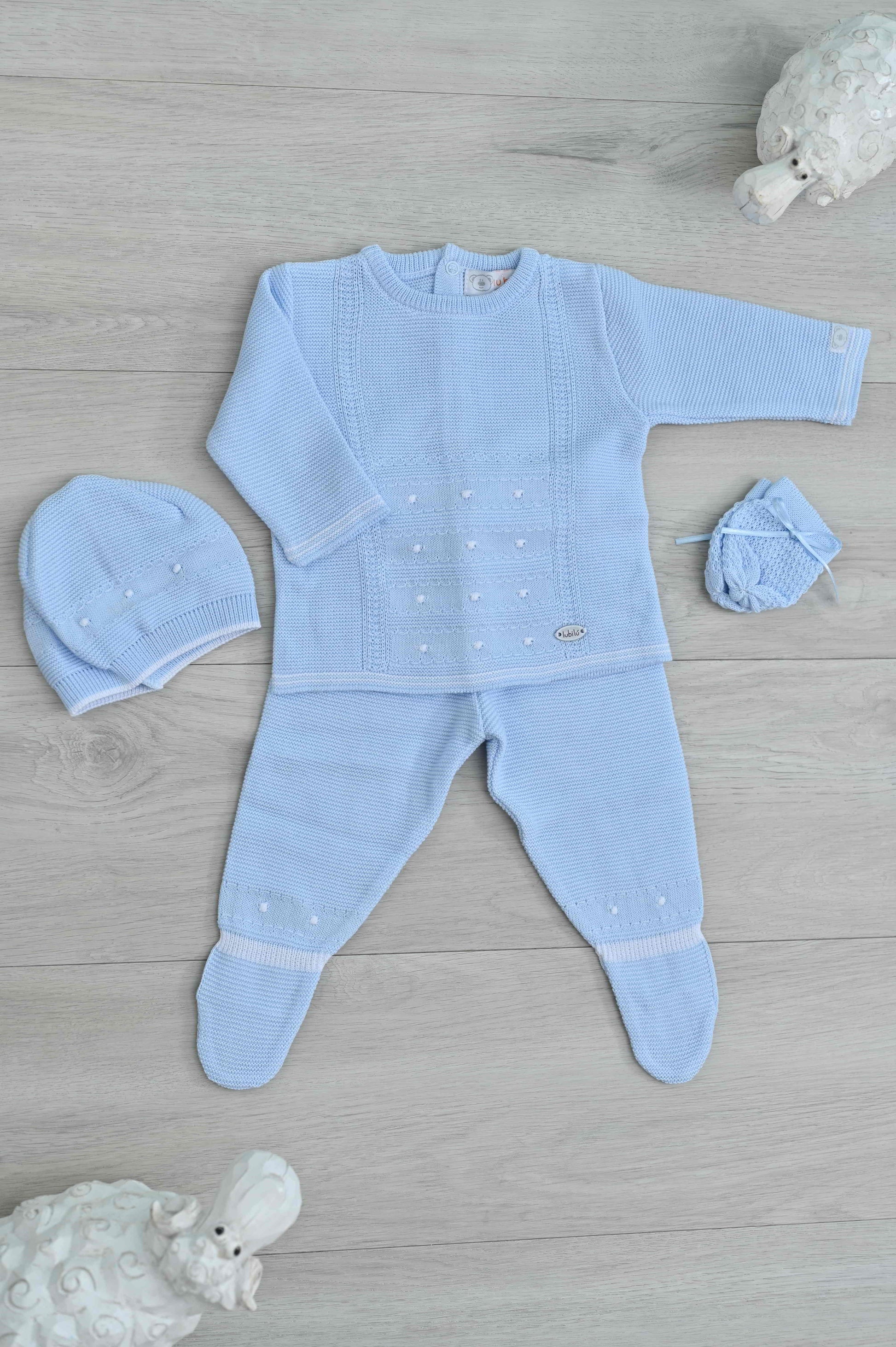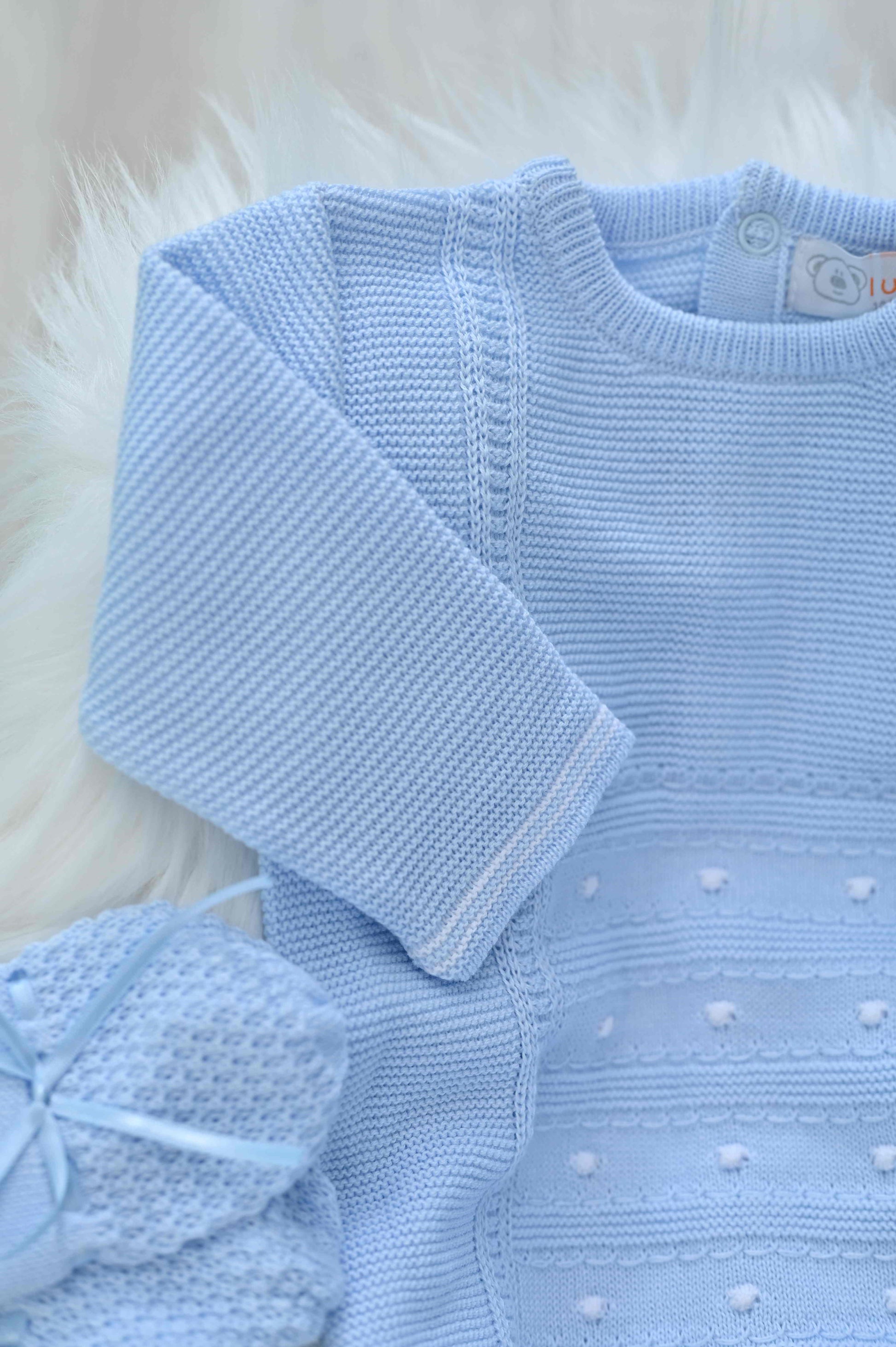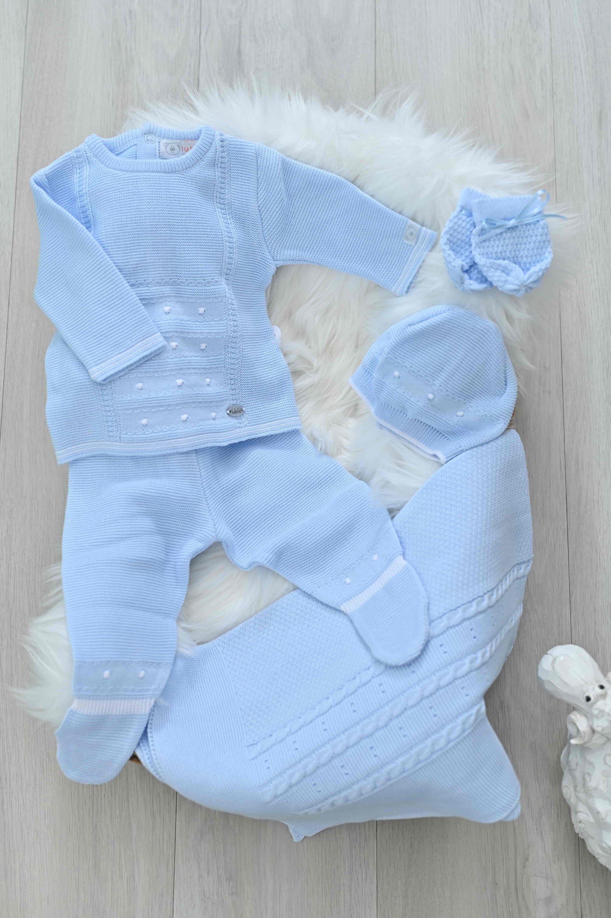 A delicate baby blue newborn set of pant, shirt, mittens and hat, adorned with custom white details — the perfect blend of elegance, softness, and love for your little one’s first days. A timeless combination of elegance and tenderness, made to wrap your newborn in comfort and love.