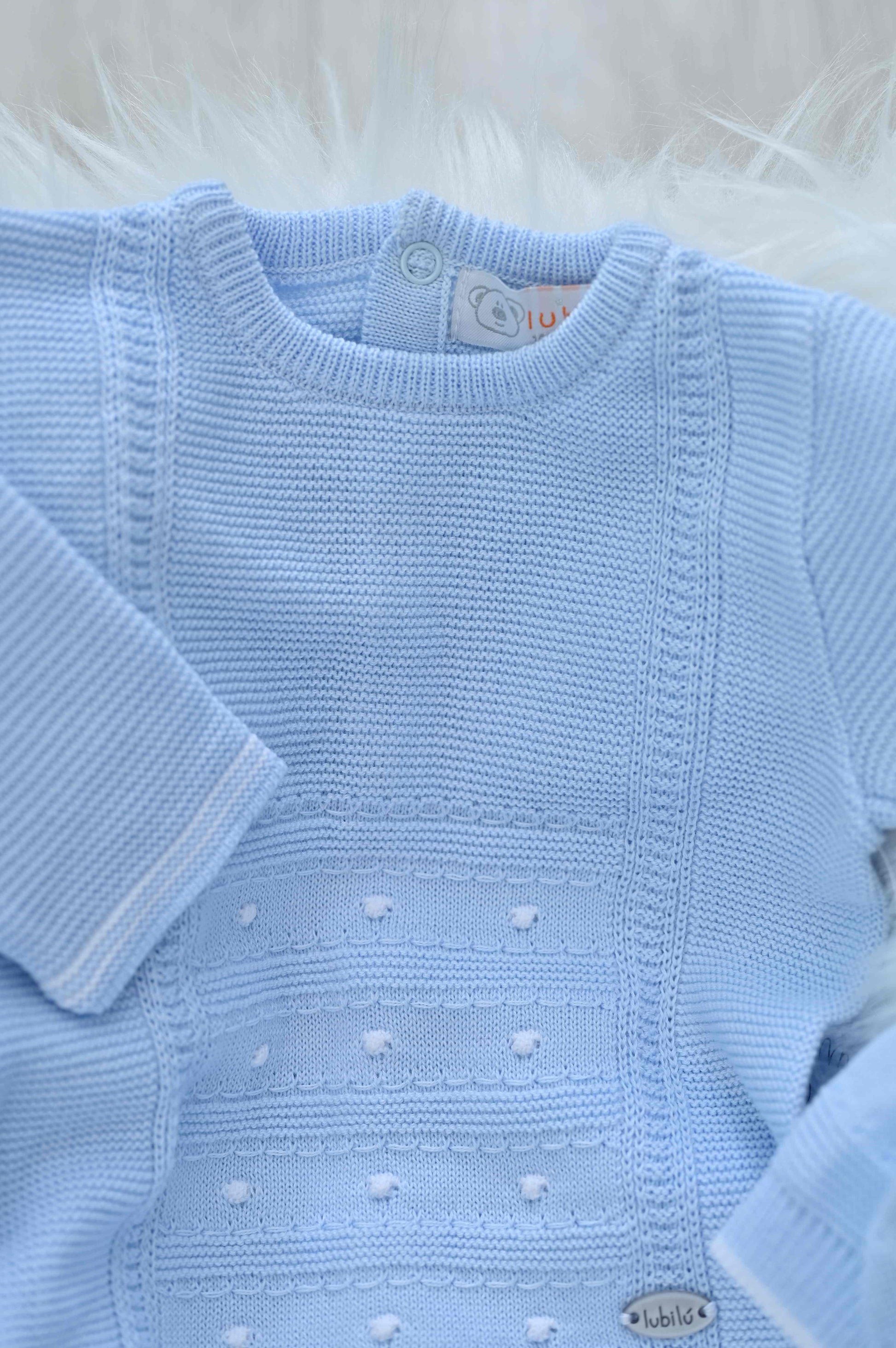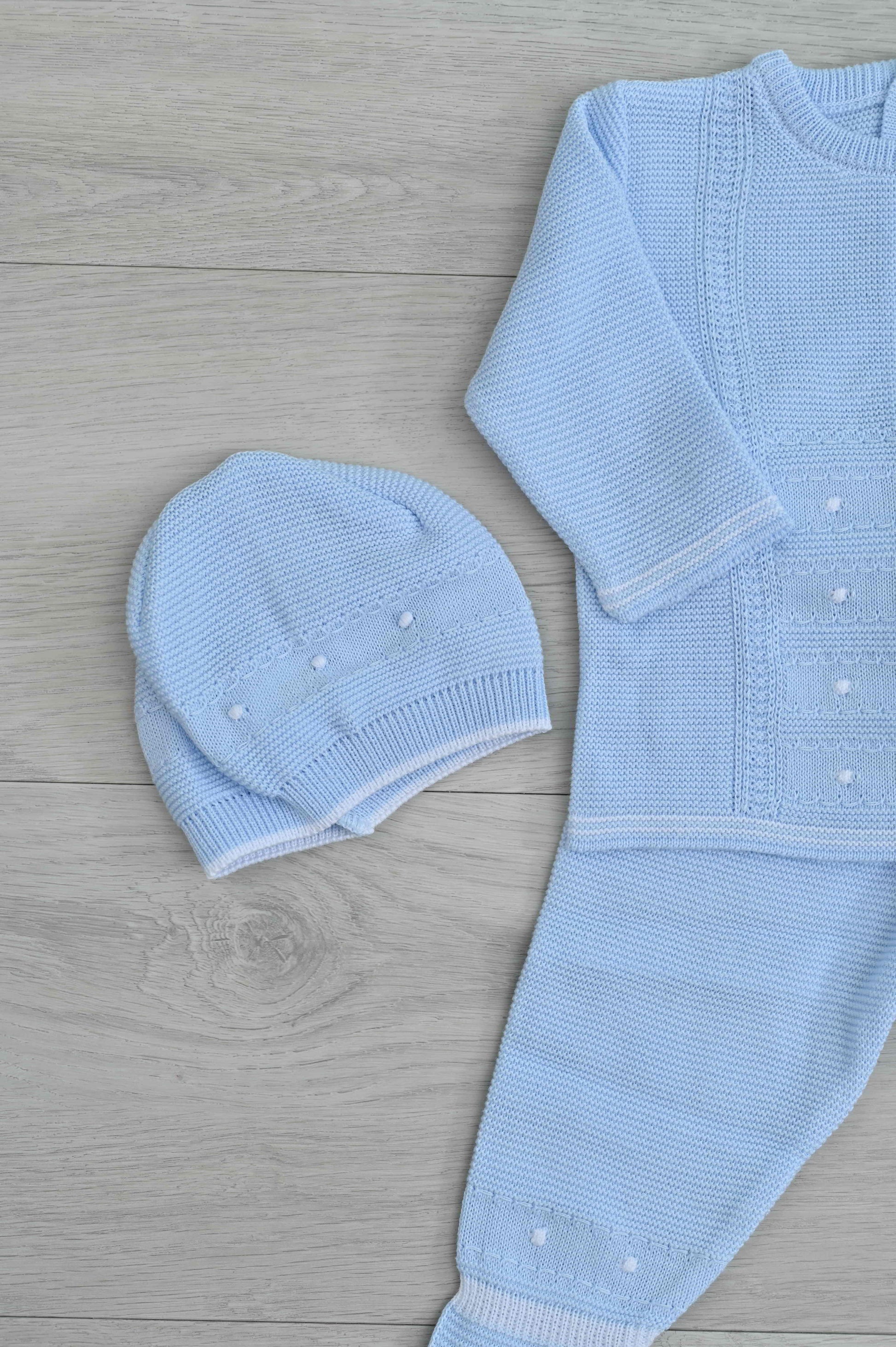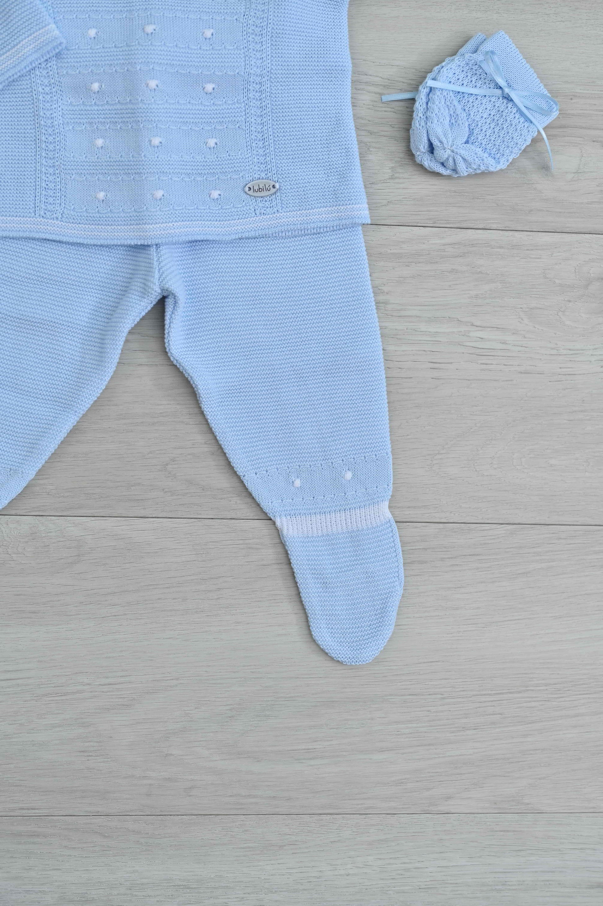 A delicate baby blue newborn set of pant, shirt, mittens and hat, adorned with custom white details — the perfect blend of elegance, softness, and love for your little one’s first days. A timeless combination of elegance and tenderness, made to wrap your newborn in comfort and love.