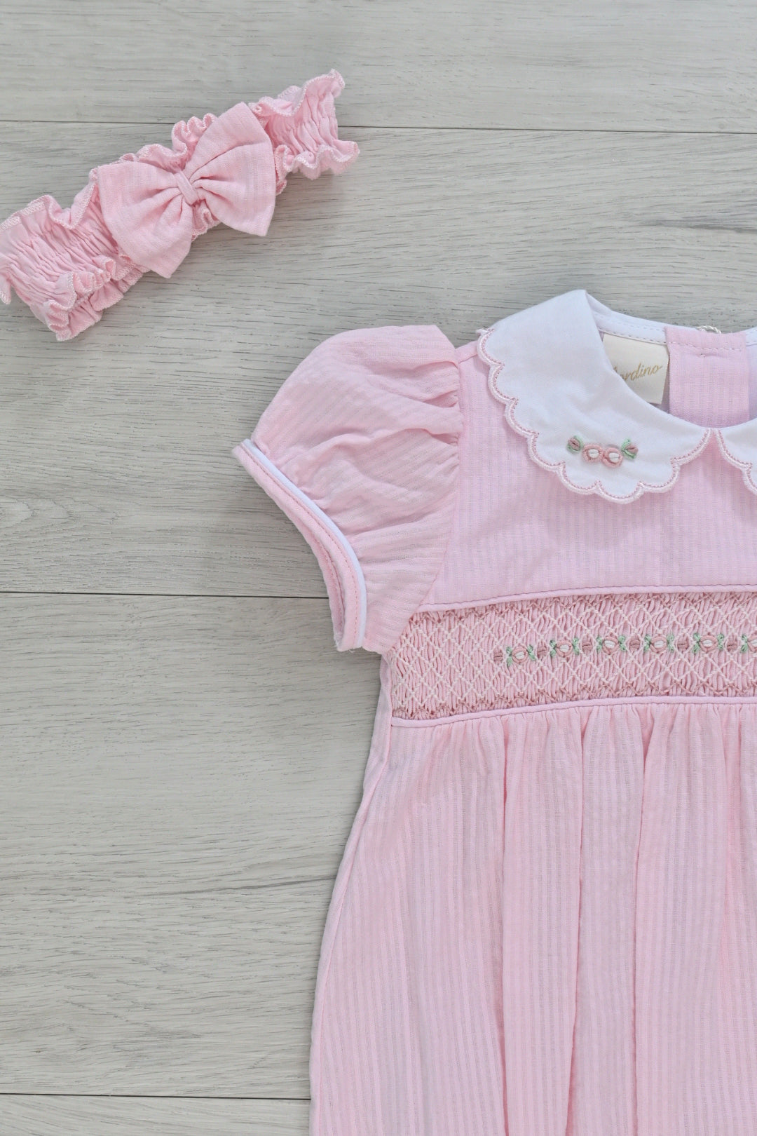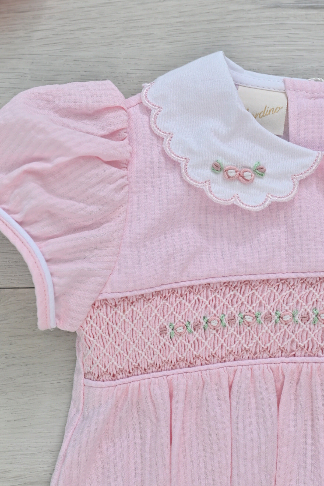 Beautiful pink bubble with elegant and timeless smock and rococo details to make it a piece to cherish forever.